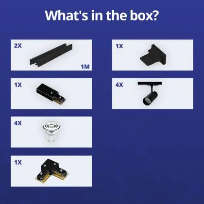 Beschrijving Complete Set 1-Fase Rail L 1 x 1 Meter Zwart | incl. 4x Spot + GU10 2700K 3W Dimbaar + Eindkap, Voedingsconnector en L -Verbindingsstuk